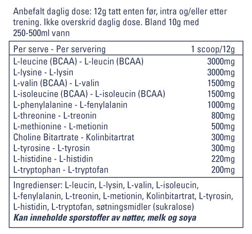L-leucine, L-lysine, L-valine, L-isoleucine, L-phenylalanine, L-threonine, L-methionine, Choline Bitartrate, L-tyrosine, L-histidine, L-tryptophan.